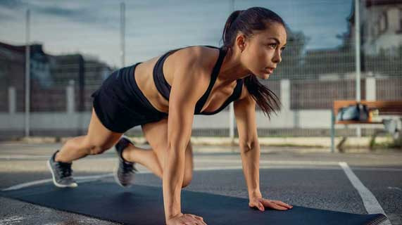 | ③ | 마운틴 클라이머 | 팔 뻗고 플랭크 자세에서 무릎을 번갈아 가슴 쪽으로 당기기. 빠르게! |